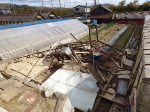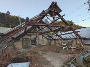 一部が残っていた2号室をつぶしました。チェーンソーで切ってロープをかけて倒す・・