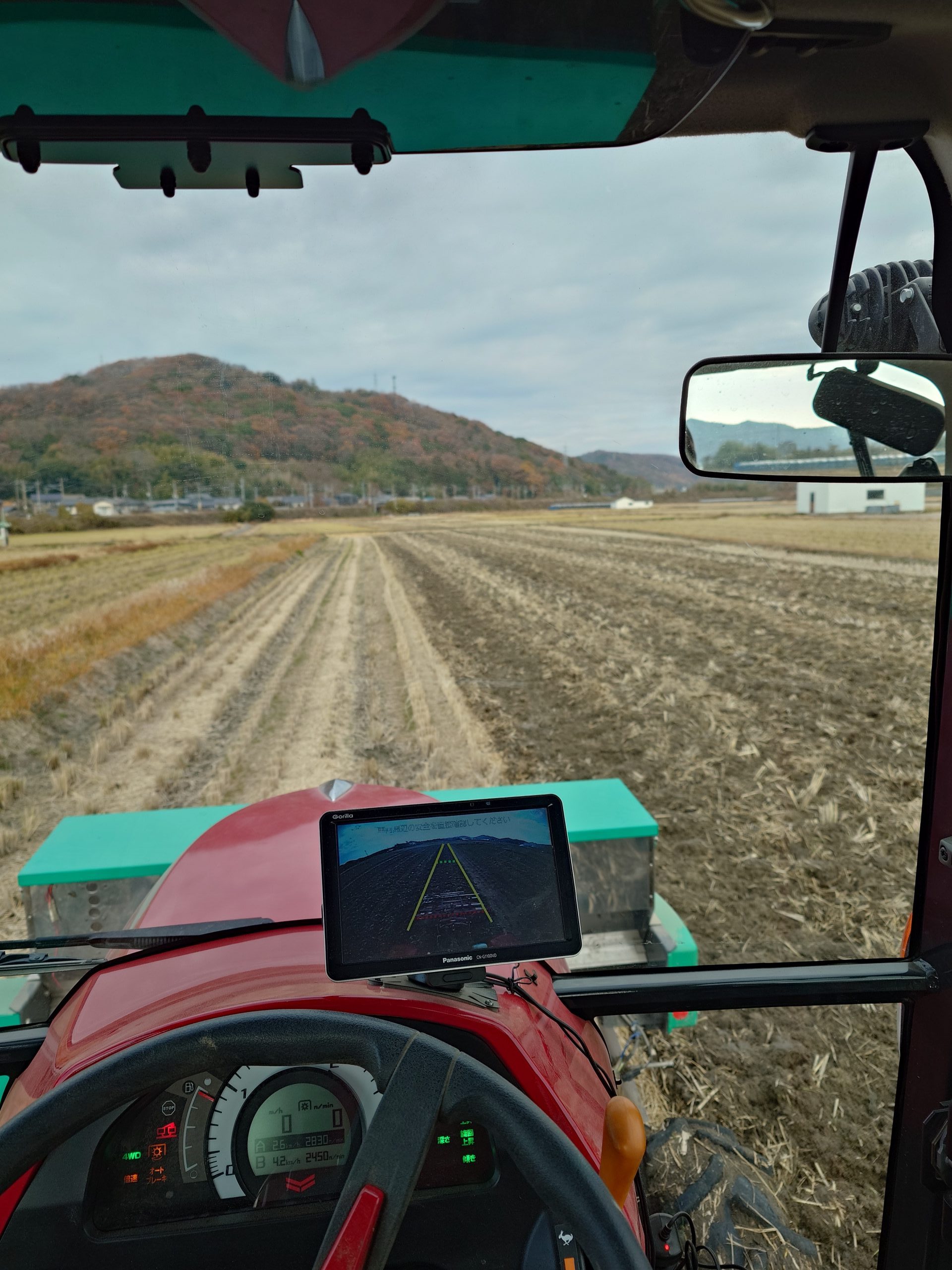 雨が降らない間にと、土づくり肥料を散布しながら、耕うん中
