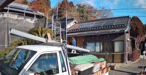 板金屋さんが樋の仕上げに来てます。いつもあふれるところは大型の樋になります。